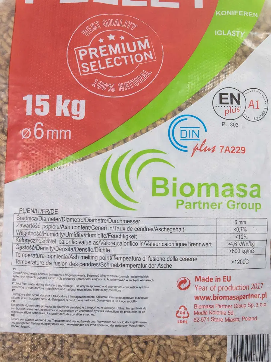 Granulés (pellets) de bois avec le label de qualité EN+ A1 / DIN+ sont d’une très haute qualité. Ces pellets de bois se caractérisent par une la valeur énergétique la plus élevée (5,4 kWh/kg), une combustion propre et des faibles taux de cendres (0,6%) . Les pellets de bois à 100% de résineux (connus sous le nom de «pellets blancs») peuvent être stockés à sec pendant longtemps et sont très faciles à utiliser grâce aux emballages de 15 kg.